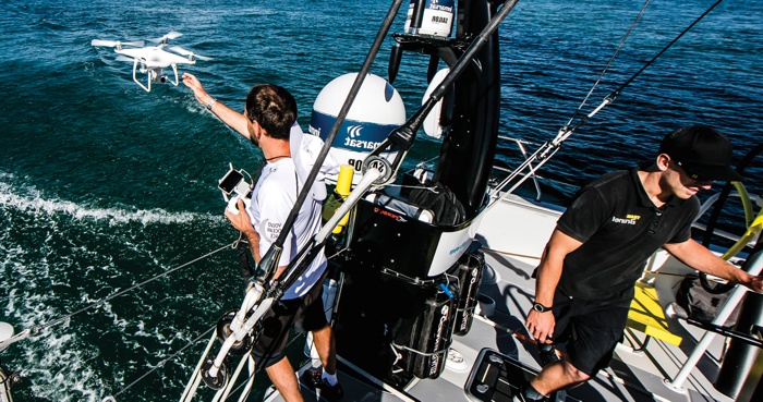 el dron en un barco rodeado de antenas y jarcias. Ojo con los