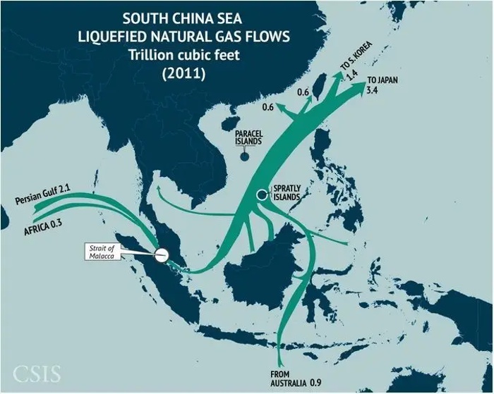 esta área navegan todos los mercantes chinos hacia el estrecho de Malaka, soportando 1/3 de todo el transporte de mercancías mundial y