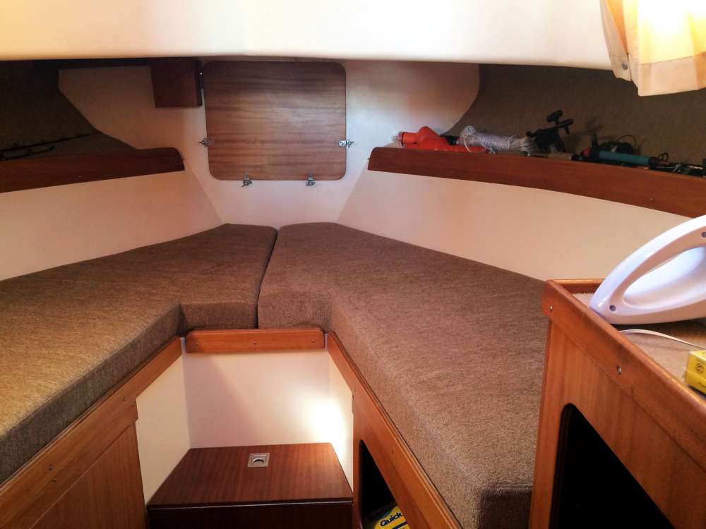 Camarote en proa de matrimonio, lavabo ducha interior, armario para colgar la ropa, cocina con nevera, comedor convertible en cama. |