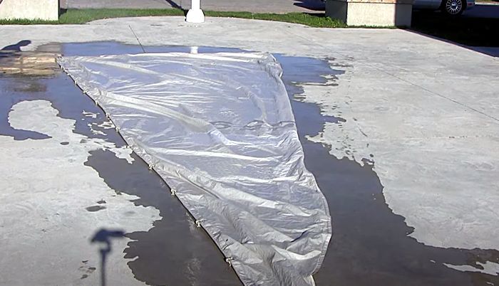 basura o una piscina de tipo desmontable, a modo de gran bañera, en la que sumergir la vela plegada