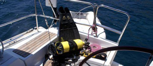 escarpines, gafas de buceo y cinturón de plomos. Es todo lo