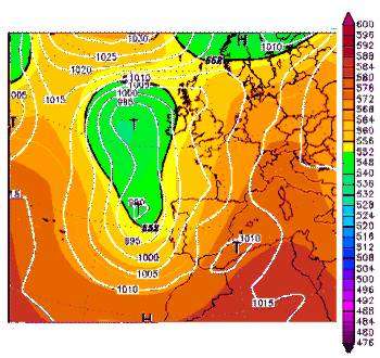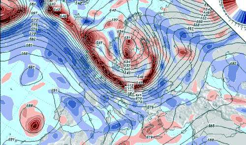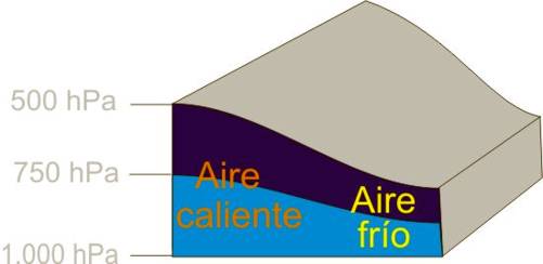 la curva de 500 hPa se encuentra a una altitud inferior, o lo